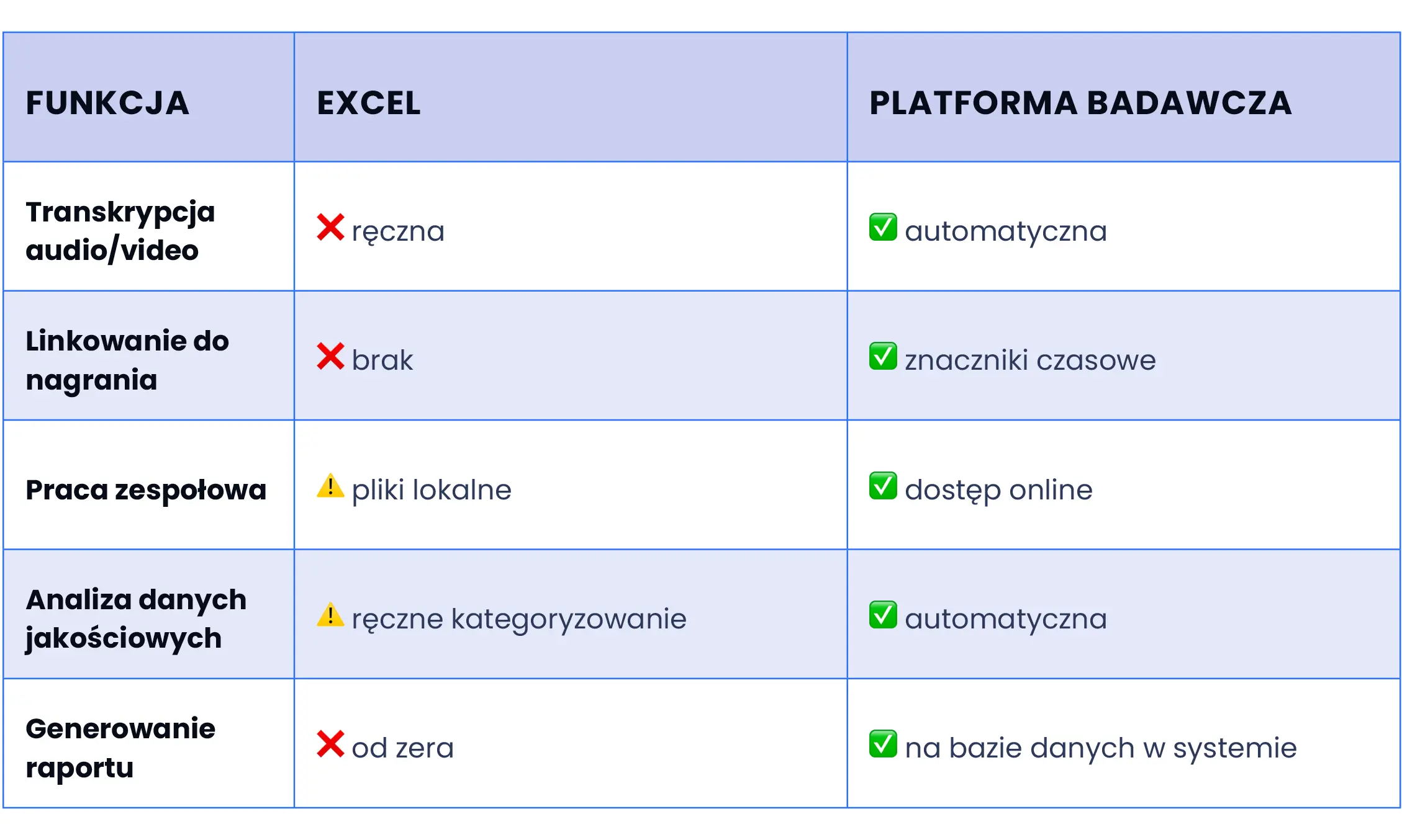 Przez lata Excel był oczywistym wyborem: dostępny, znany, elastyczny. Doskonale sprawdzał się przy prostych projektach czy analizie danych ilościowych. Jednak w badaniach jakościowych – szczególnie tych złożonych, wieloetapowych – staje się zbyt ograniczony.
